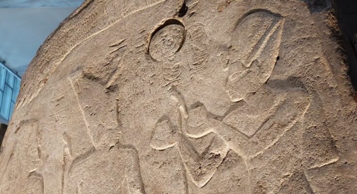 داخل المتحف المصري، وأثناء تجولك بين ردهاته، تجذبك تلك اللوحة المصنوعة من الحجر الرملي، وعلى أحد جوانبها نقش لقرص الشمس الذى تخرج منه الأشعة المصورة على شكل الأيادي، والتى ترمز للمعبود «آتون» الذى عبده الملك «أمنحتب الرابع» أو «إخناتون» ونشر عبادته بين المصريين، أما الجانب الثانى فيظهر فيه الملك «حورمحب» وهو يقدم القرابين للمعبودات.