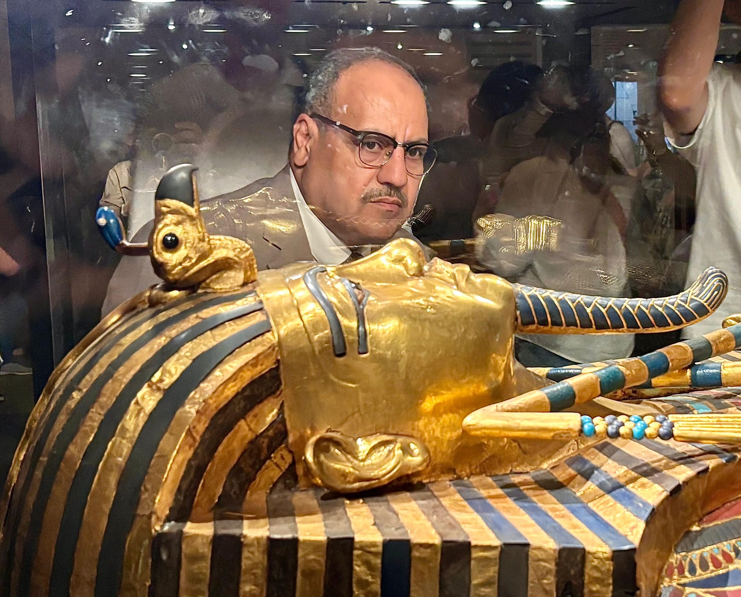 ولأنني قد زرت المتحف قبل الافتتاح الرسمي بأكثر من عام ونصف، لكن لم أكن قد زرت قاعة الفرعون الذهبى فلم تكن قد فتحت بعد؛ فحرصت أولا أن أزور تلك القاعة لأشاهد مقتنيات ” توت عنخ آمون” التي تجاوزت الخمسة آلاف و398 قطعة أثرية، وهي المقبرة الوحيدة الكاملة التي لم ينهب منها شىء.