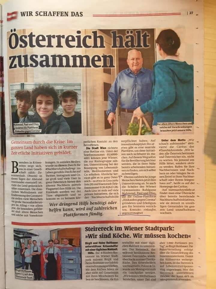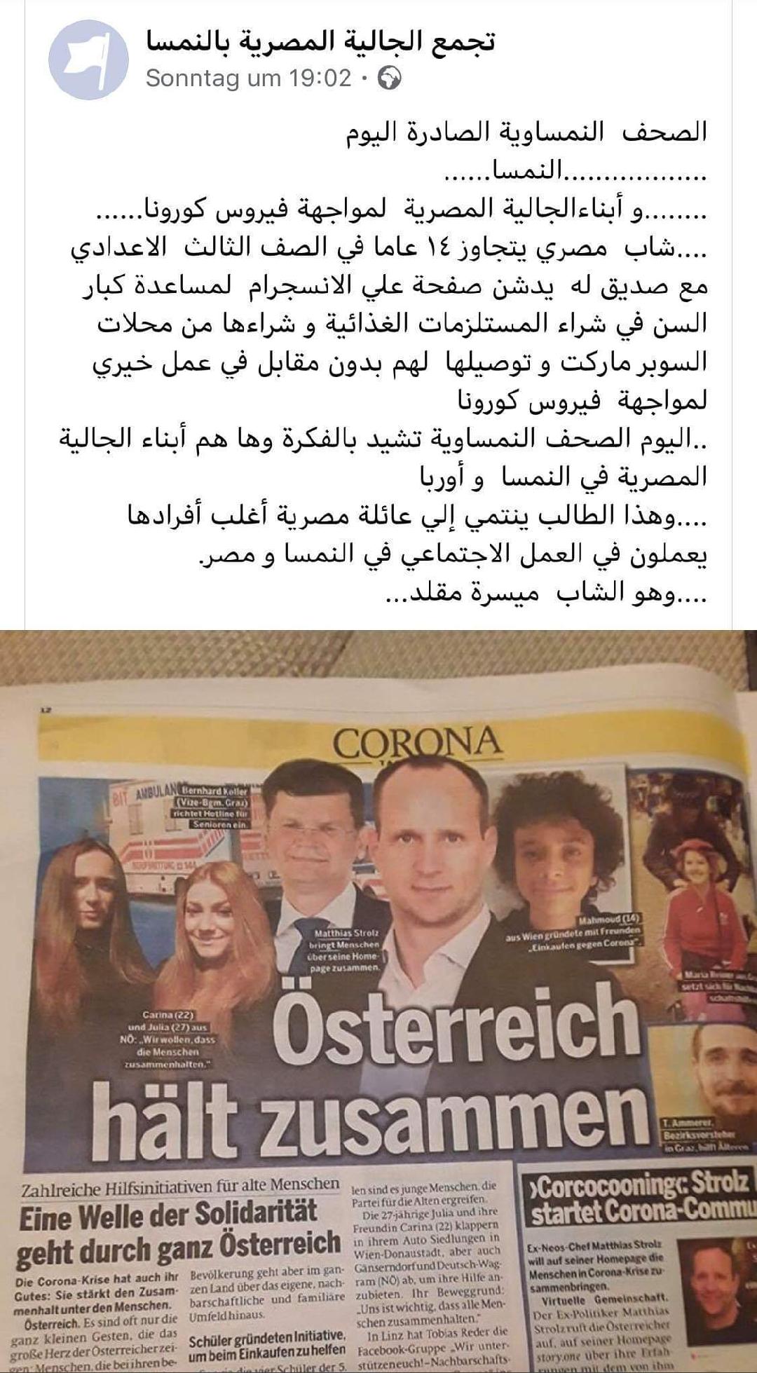 وبينما تعيش الأسرة فى هدوء، فجأة وأثناء حالة الرعب التى تجتاح العالم كله وحالات الحجر الصحى وحظر التجول إخلاء الشوارع من البشر وإخلاء المدارس من الطلبة والحبس بالمنازل، فى هذه الحالة يصبح ميسرة أو محمود هذا الطفل اللطيف الجريء والذى يتمتع بشهامة وجدعنة أبناء الصعيد رغم أنه ولد وعاش فى النمسا والذى أطلق عليه “الطفل المعجزة”ي صبح حديث مواقع التواصل الاجتماعى وحديث الصحف النمساوية وقنوات التليفزيون العربية والنمساوية بعد أن بدأ محمود بعد توقف المدارس يفكر فى طريقة يساعد بها المجتمع الذى يعيش فيه كما ورث من والده ووالدته حب مساعدة الغير وقرر محمود هو وثلاثة من أصدقائه ودون أى خوف من الإصابة بفيروس كورونا عمل مبادرة لمساعدة كبار السن فى فيينا عاصمة النمسا والذين ليس لديهم من يساعدهم وذلك لإحضار احتياجاتهم من المأكل والمشرب والأدوية وكل ما يحتاجونه حتى لا يضطروا إلى الخروج من المنزل والتعرض لمخاطر الإصابة بفيروس كورونا. وبدأوا بالفعل فى إنشاء صفحات على مواقع التواصل الاجتماعى ووضعوا أرقام تليفوناتهم وبدأت الاتصالات لهم بالفعل ليقوموا بهذا العمل الرائع ولتنتشر الفكرة على نطاق واسع وتبدأ الصحف والإذاعة والتليفزيون النمساوى فى الحديث عن ميسرة وأصدقائه وليزيد عدد من يحتاج إلى مساعدتهم وليبدأ عدد كبير جدا من الشباب فى الانضمام إلى المبادرة ليفعلوا ما فعله ميسرة وليتصل به السفير المصرى فى النمسا ليشكره وليبلغه تحياته على عمله الرائع.
