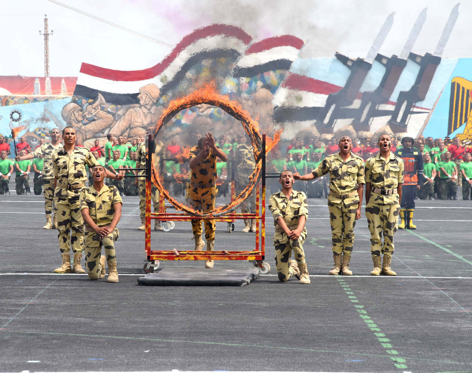 وعقب مراسم الاستقبال انطلق عرض اللياقة البدنية الذى شارك فيه 4100 طالب باعتبارهم الركيزة الأساسية فى إعداد مقاتلى معهد ضباط الصف المعلمين لما لها من تأثير إيجابي لإعداد الفرد المقاتل بدنيا ونفسياً وذهنياً والوصول به إلى التميز فى الأداء والإحتراف فى تنفيذ المهام وقدم الطلبة مجموعة من التمارين والانشطة الرياضية المبتكرة التي يتم التدريب عليها يوميا داخل المعهد لرفع لياقتهم البدنية، وعرضا لمهارات الاشتباك والدفاع عن النفس تضمن عددًا من التمارين الأساسية والمتقدمة لرياضتي الكونغ فو والكاراتية، واستعرض الطلبة مهاراتهم في اجتياز وعبور الموانع المشتعلة الثابتة والمتحركة متدرجة الصعوبة والصعود والنزول من الارتفاعات المختلفة، وفنون القتال المتلاحم والسيطرة علي الخصم باستخدام الدنفة والمونشاكو أظهرت مدي الجرأة والإقدام والروح الهجومية التي تؤهلهم لتنفيذ كافة المهام تحت مختلف الظروف، وفى لمسة وفاء لشهداء الوطن الأبرار الذين ضحوا بكل ما هو غالٍ ونفيس من أجل رفعة الوطن وصون كرامته سطر بأجسادهم لوحة وهتفوا من أعماق قلوبهم « المجد للشهداء».