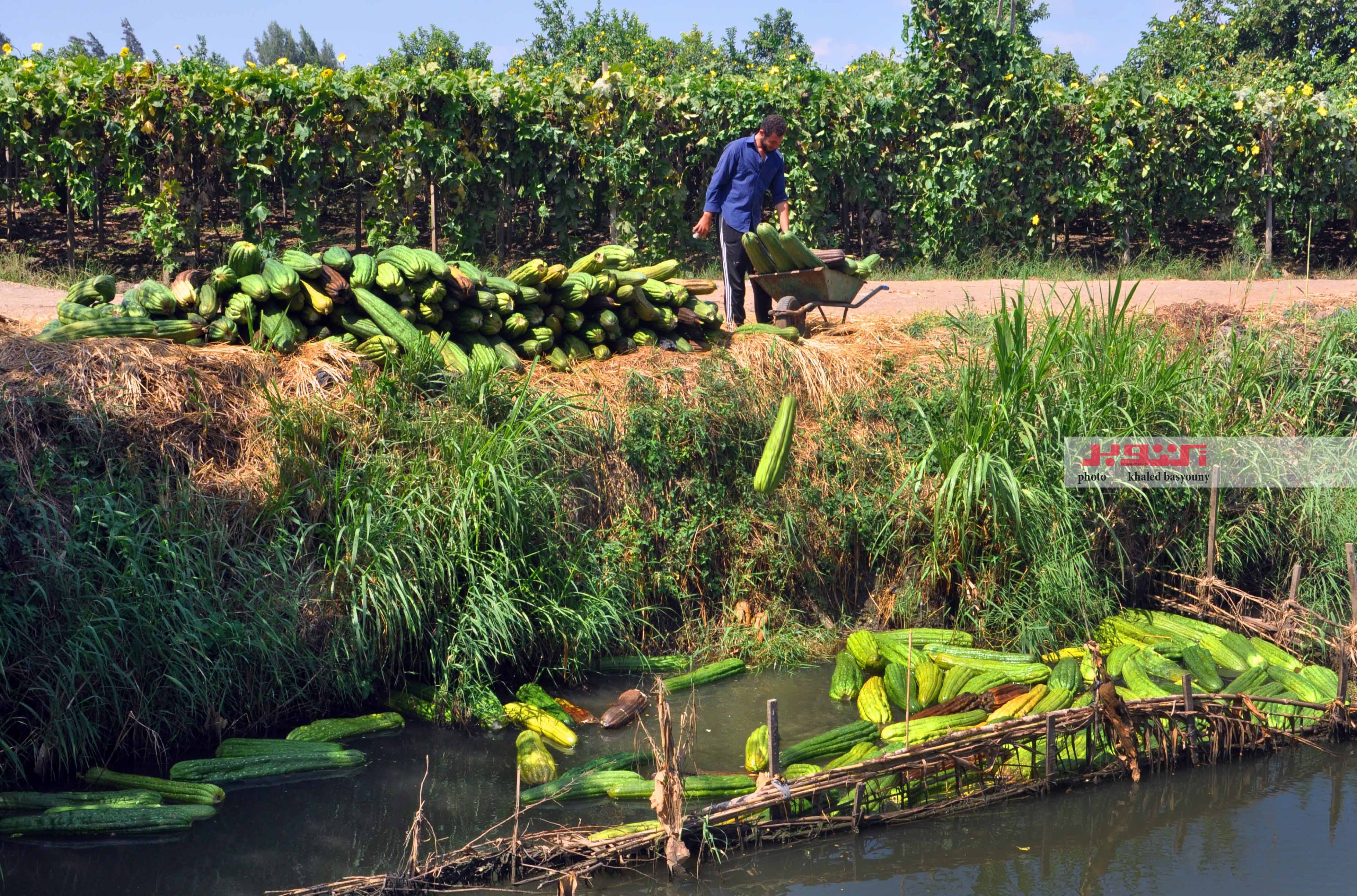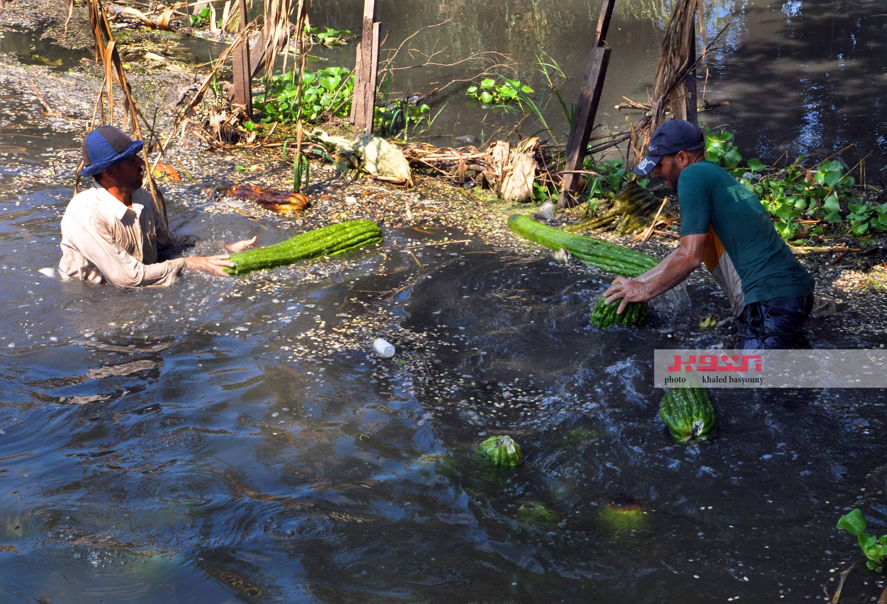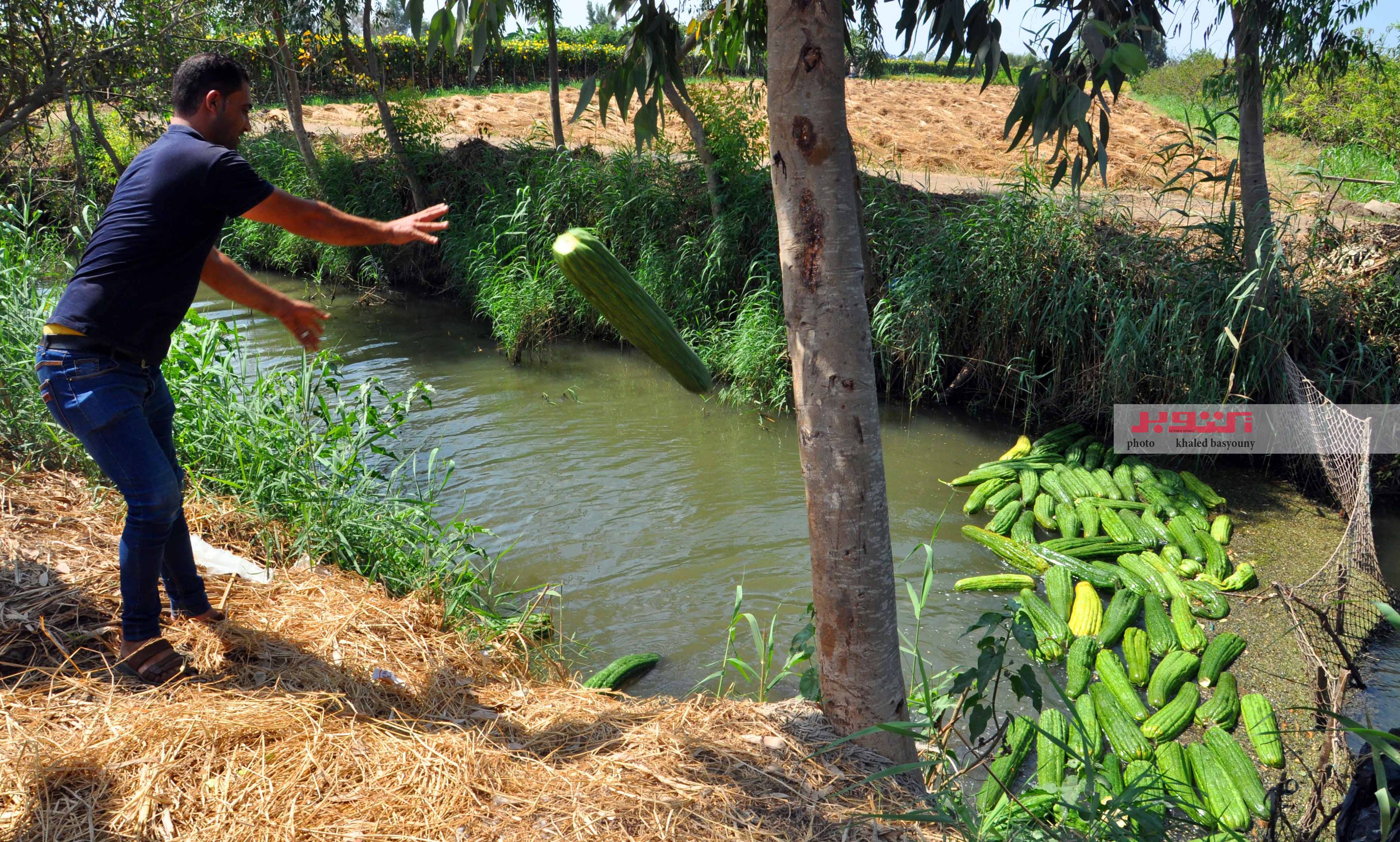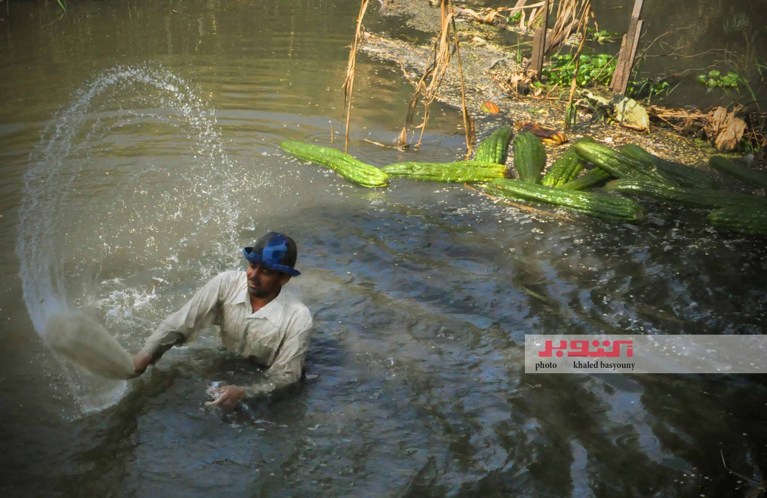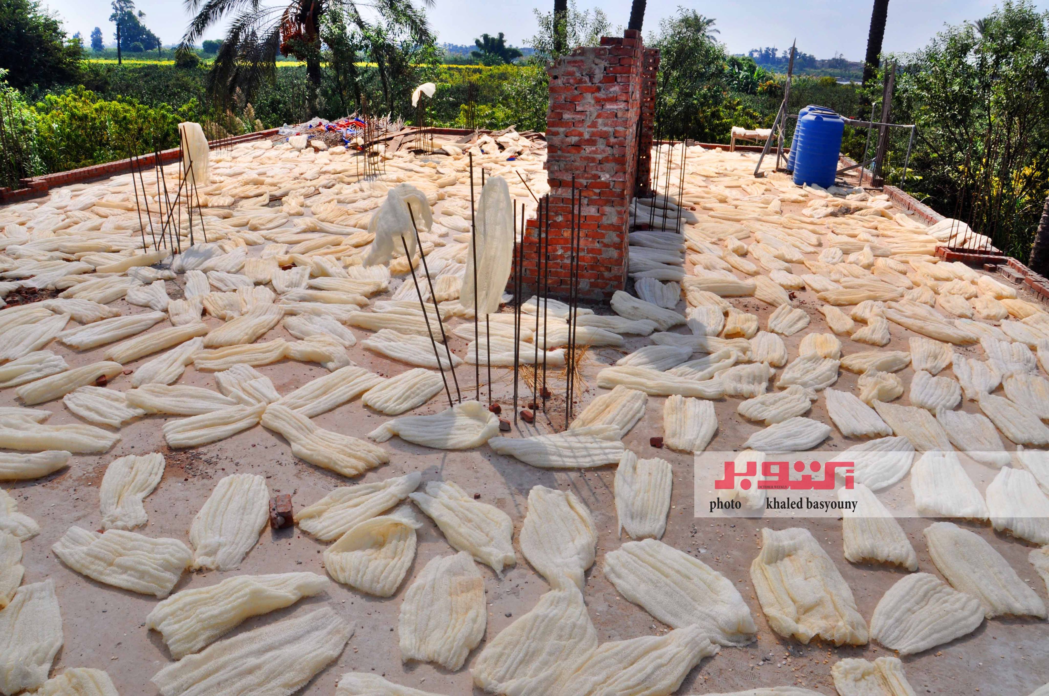 لا تنتهى مهمة الفلاح عند قطف الثمار كما يقول «حمزة الباجورى» أحد تجار اللوف فى محافظة كفر الشيخ، فبعد أن تنضج ثمار اللوف وتصبح جاهزة للتقشير، تبدأ مرحلة أخرى لا تقل أهمية، وهى الغرز والتعطين، فيقوم العامل بالنزول إلى مياه الترعة، وغرز اللوفة لمدة يوم أو يومين على الأكثر – نتابع تلك العملية التى لا تحتاج لخبرة مسبقة مثل عملية قطف الثمار كما يقول الفلاحون، فى اليوم التالى يتم انتشال اللوف وتقشيره، ثم غسله وتنفيضه جيدًا حتى يصبح نظيفًا تمامًا، وبعد الانتهاء من غسله جيدًا، يتم نشره تحت أشعة الشمس على الأرض أو الأسطح لكى يجف تمامًا، ويشدد حمزة على أهمية ترك اللوف كى يجف بشكل كامل، لأنه إذا تم جمعه قبل ذلك، فيمكن أن يفسد أثناء عمليات التصنيع.