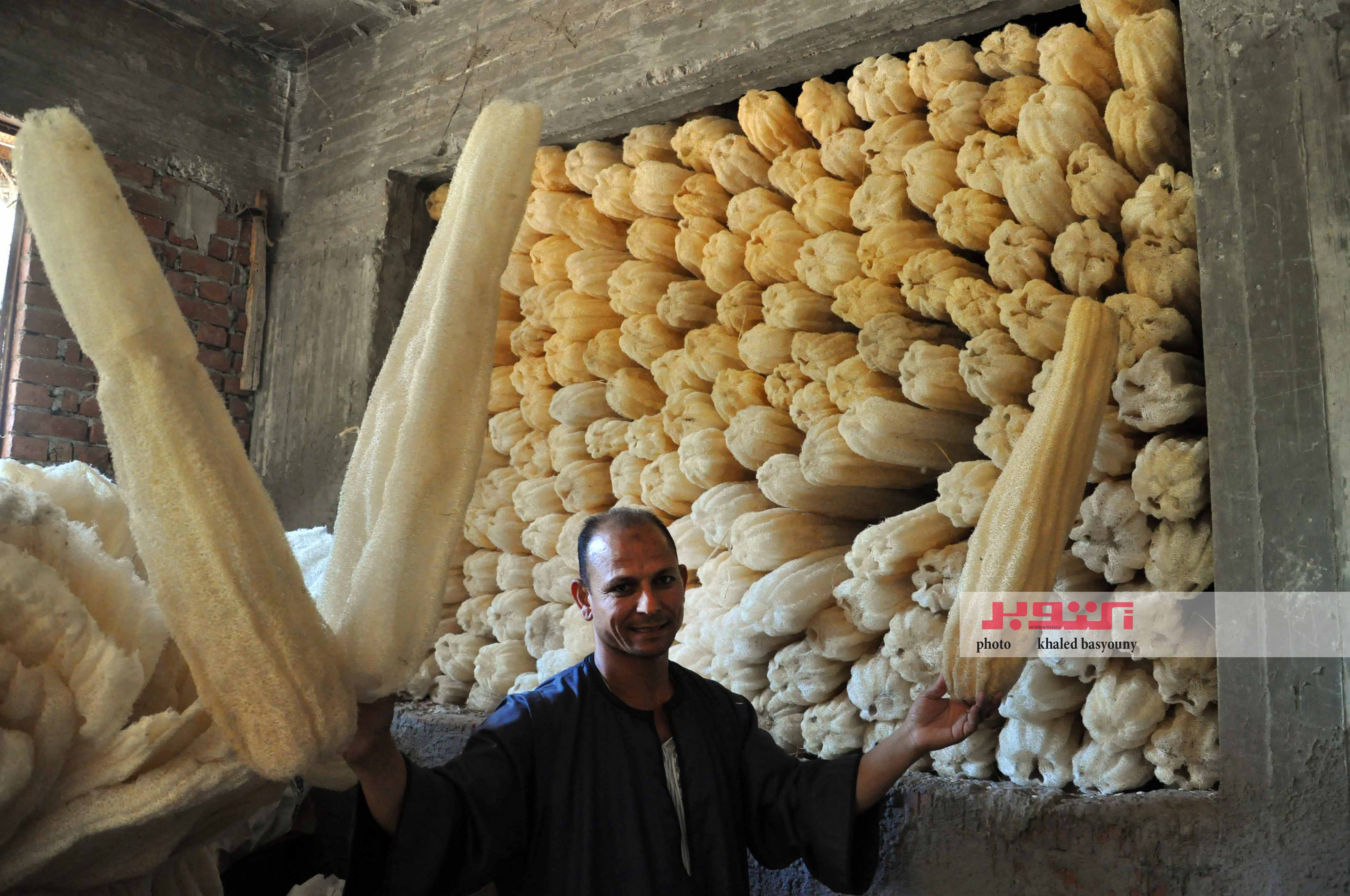 «اللوف».. هذه القطعة الخشنة التى لا يستغنى عنها أى بيت مصرى، والتى لا تكتمل النظافة الشخصية إلا بها، كما يقول الأجداد أو الأكبر سنًا، حتى أصبحت عادة تتوارثها الأجيال، هل تساءلت يومًا عن كيفية زراعتها وصناعتها حتى تصل إليك فى شكلها النهائى.. هل تعرف أنها فى الأصل كانت زهرة صفراء تشبه الياسمين، وعند جمعها من على الأشجار تكون ثمرة عملاقة مغطاة بقشرة خضراء، وحتى تصل إليك لابد أن تكون مرت بمراحل تفتيح وتصنيع، حتى تكون فى يدك بالشكل المتعارف عليه، وبلونها الأصفر المميز؟