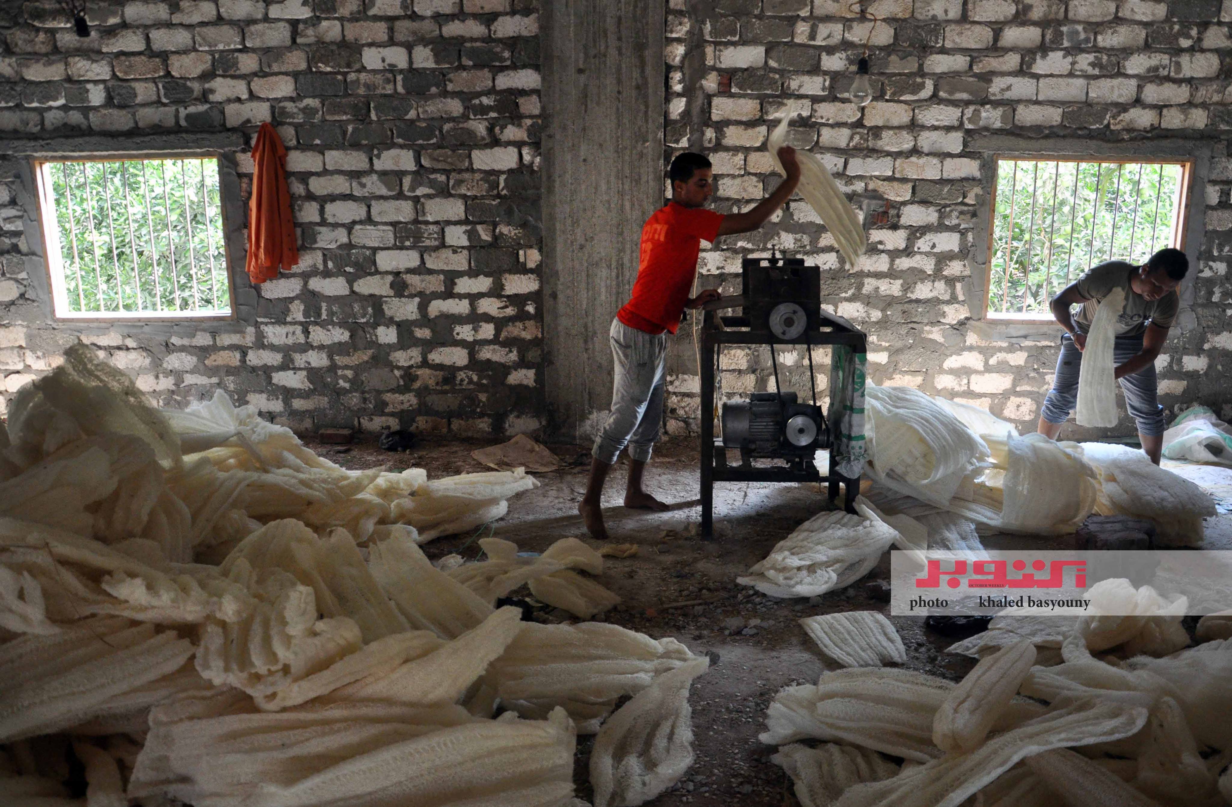 داخل أحد مصانع اللوف فى القرية يسير العمل بهمة ونشاط واضح، الكل يركز فى المهام الموكلة إليه، ودورة العمل تسير بانتظام، فهناك العامل الذى يقوم بالتبييض والتفتيح، وآخر يفرد اللوف على الماكينة، بينما يقوم آخرون بالتقطيع والقص.